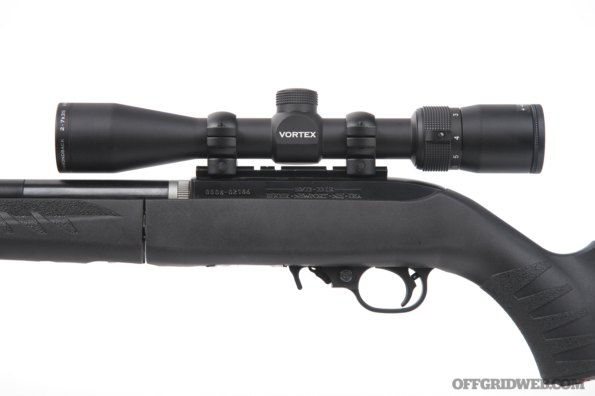 Prior to testing any of the new stocks, we picked up a Vortex Diamondback Rimfire scope for our 10/22. It features 2-7x magnification, a 35mm objective lens, and a simple V-Plex reticle with parallax set to 50 yards (as opposed to 100 yards for the non-rimfire models). At 11.6 inches long and 14.2 ounces, it doesn't sacrifice much of the Takedown's portability — if that's your top priority, you'll probably be using a micro red dot sight, but we prefer the versatility of a variable-magnification optic in this case.